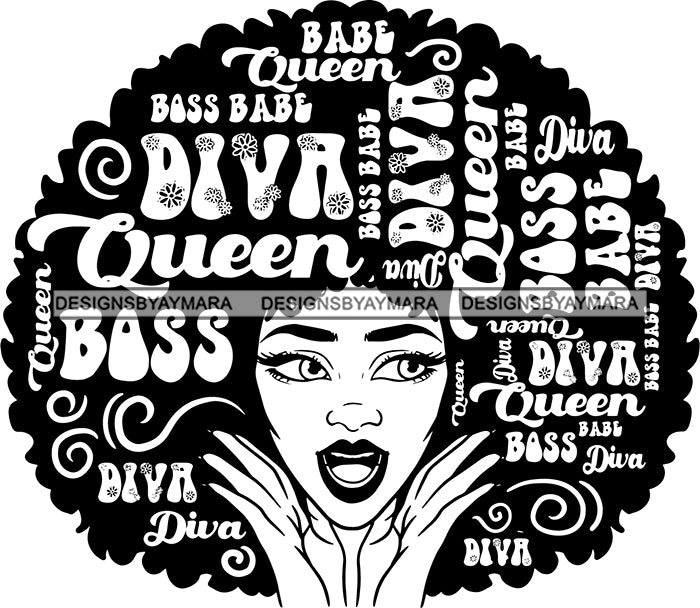 Afro Strong Woman Hair Boss Queen Diva Life Quotes Afro B/W SVG Cutting Files For Silhouette Cricut More