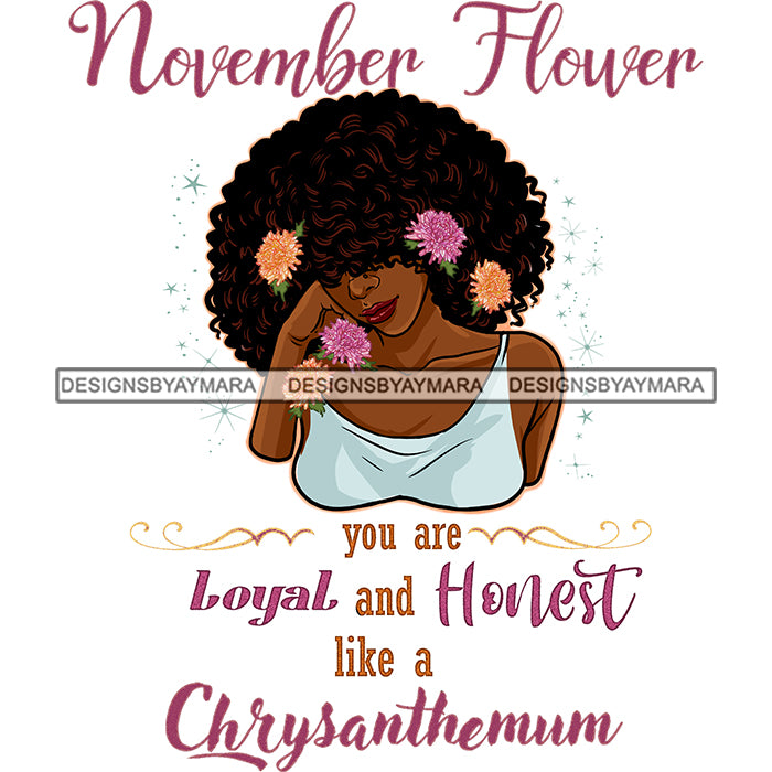 November Flower Big Afro Hair Woman Pink and Yellow Flowers In Hair JPG PNG Clipart Cricut Silhouette Cut Cutting
