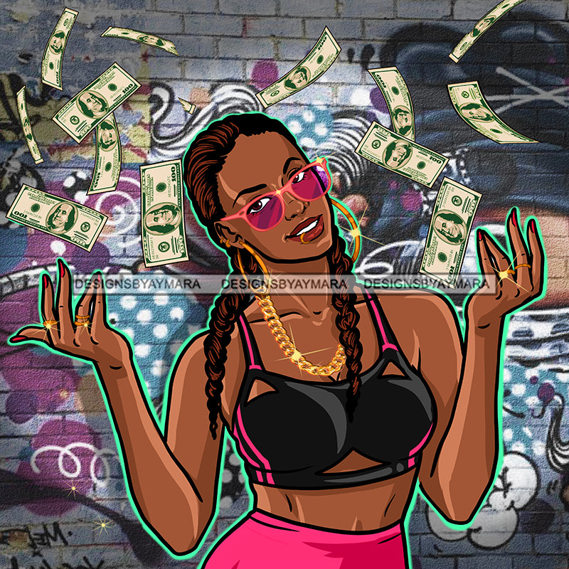 Sassy Diva In Black And Pink Tossing Dollar Bills Braids Graffiti Wall JPG PNG Clipart Cricut Silhouette Cut Cutting