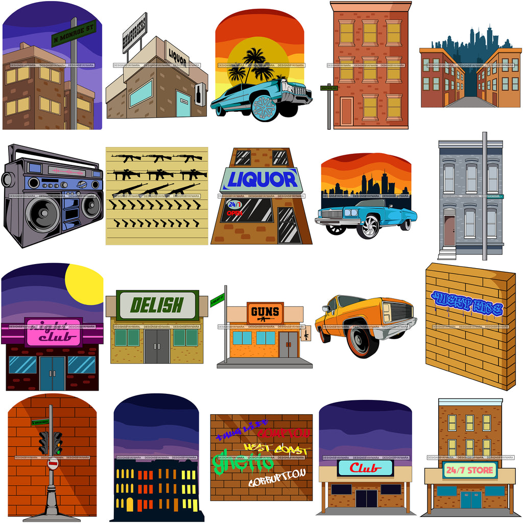 Bundle 20 Hood Ghetto Background Graffiti Walls Guns Projects Gangster Cars Liquor Store SVG Cutting Files For Silhouette Cricut and More