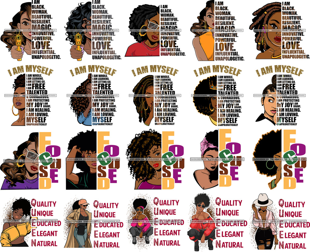 Bundle 20 Afro Black Woman I'm Myself Focused Educated Quotes Diva Layered SVG Cut Files For Silhouette Cricut and More!