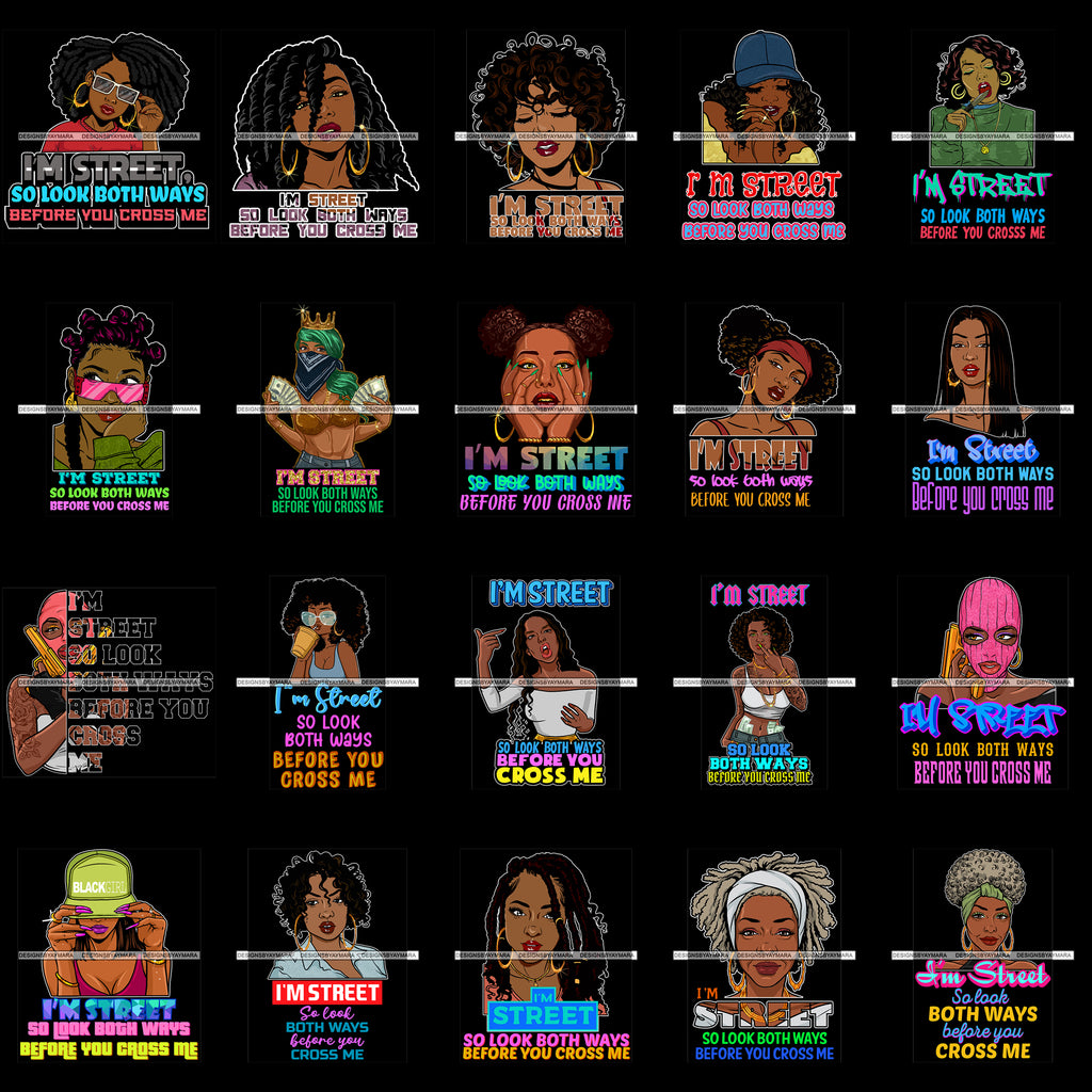 Bundle 20 I'm Street So Look Both Ways Before You Cross Me Quotes Melanin Pretty Woman Melanin Black Girl Magic Nubian Black Background SVG PNG JPG Cutting Files For Silhouette Cricut and More!