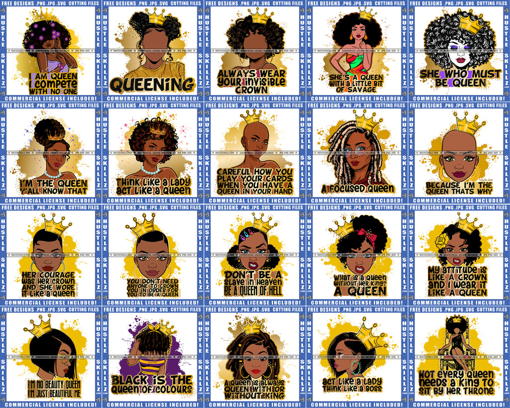 Bundle 20 Queen Gold Splash Melanin Nubian Woman Power Savage Life Quotes Crown SVG PNG JPG Cut Files For Silhouette Cricut and More!