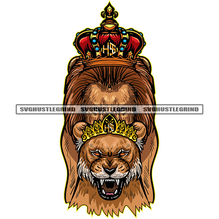 King Queen Lion Family Crown On Head Both King Hide Face Vector Stone Dimond Design Element White Background Red Eyes Long Hair SVG JPG PNG Vector Clipart Cricut Cutting Files