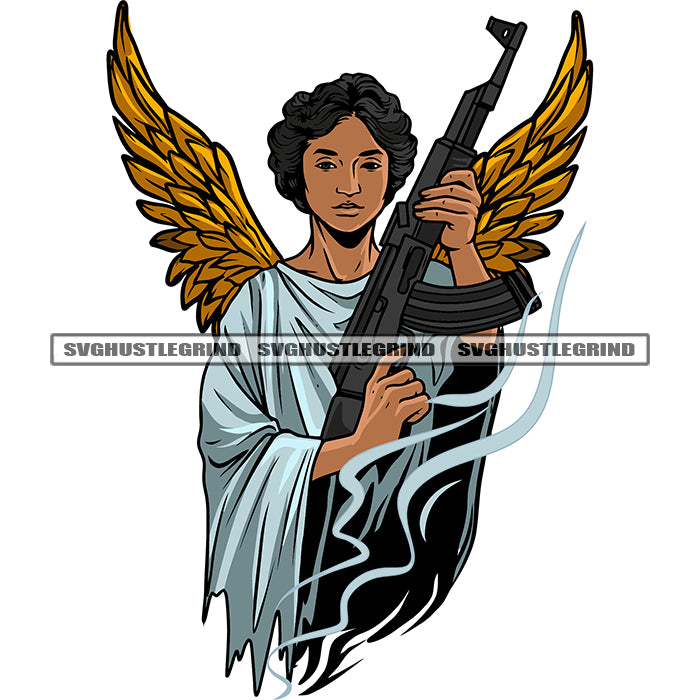 African American Angel Woman Hand Holding Gun AK47 Afro Woman Angele Wings Golden Color Design Element SVG JPG PNG Vector Clipart Cricut Silhouette Cut Cutting