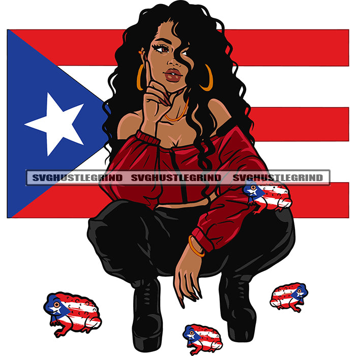 African American Sexy Woman Sitting Pose And Thinking Pose Curly Hairstyle Wearing Hoop Earing USA Flag On Background And Floor Design Element SVG JPG PNG Vector Clipart Cricut Silhouette Cut Cutting