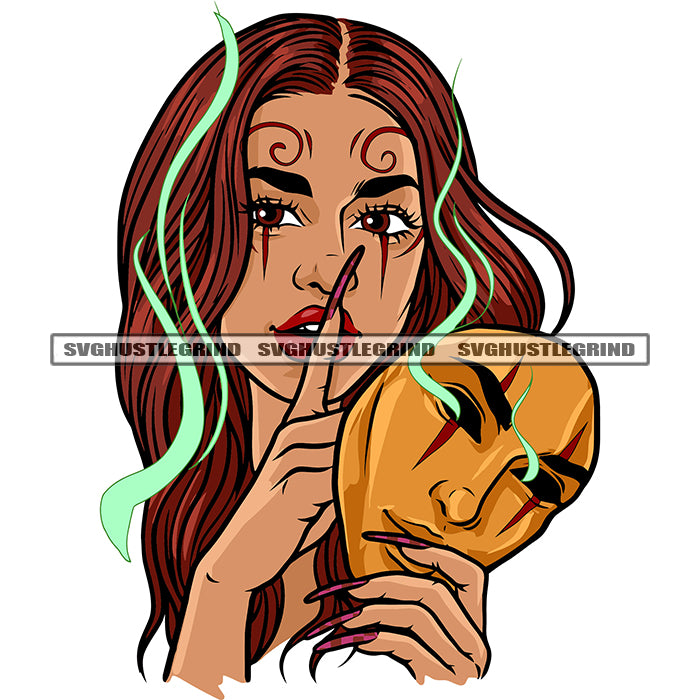 Afro Woman Showing Keep Silent Pose Smile Face Long Nail And Hand Holding Face Mask Design Element White Background Smoke Symbol Fly SVG JPG PNG Vector Clipart Cricut Silhouette Cut Cutting