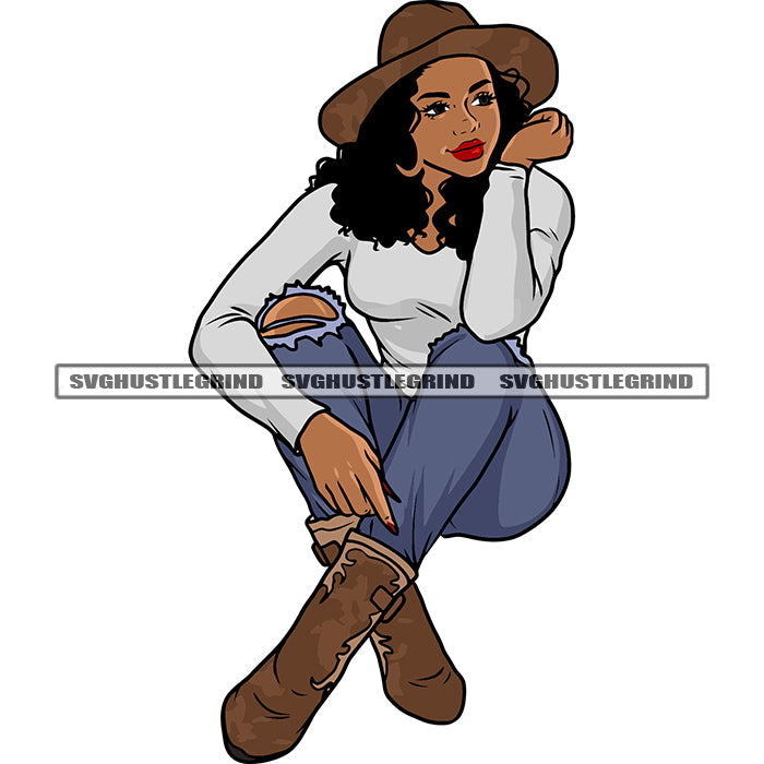 Cute African American Woman Sitting Smile Face Afro Woman Wearing Cowboy Hat Curly Long Hairstyle Design Element White Background SVG JPG PNG Vector Clipart Cricut Silhouette Cut Cutting