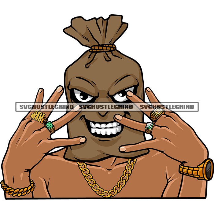 Funny Money Bag Cartoon Character Showing Finger Ring Smile Face Design Element African American Gangster Character SVG JPG PNG Vector Clipart Cricut Silhouette Cut Cutting
