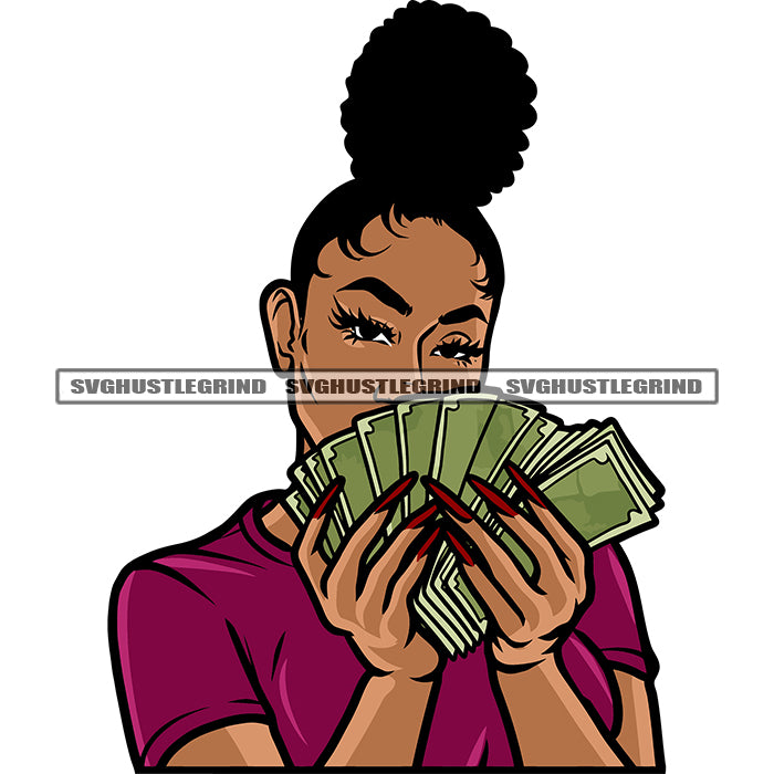 Gangster African American Woman Hand Holding Money Note Curly Hairstyle Beauty Black Beauty White Background Design Element SVG JPG PNG Vector Clipart Cricut Silhouette Cut Cutting