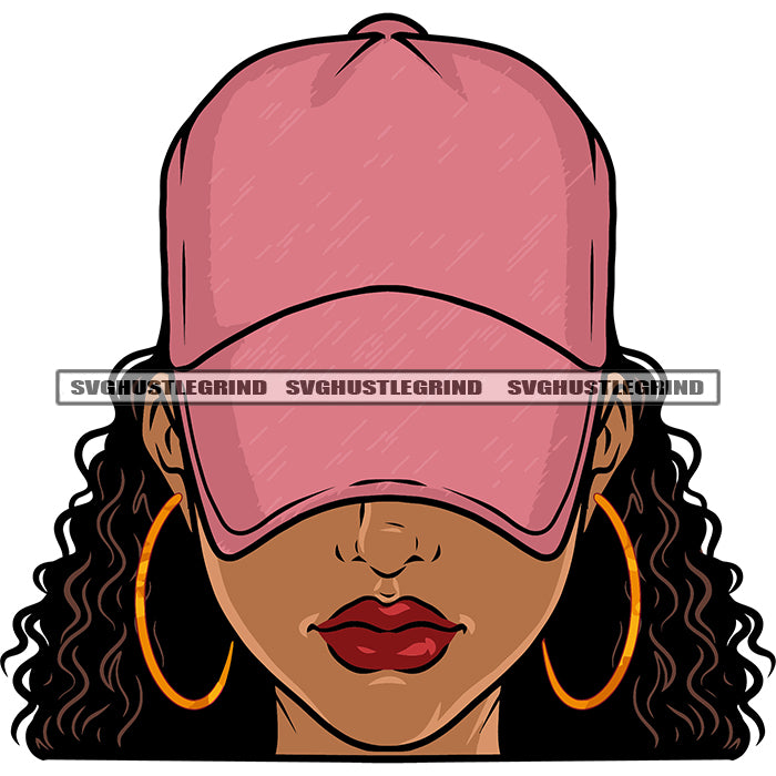 Gangster African American Woman Wearing Cap And Hoop Earing Curly Long Hairstyle Design Element White Background SVG JPG PNG Vector Clipart Cricut Silhouette Cut Cutting