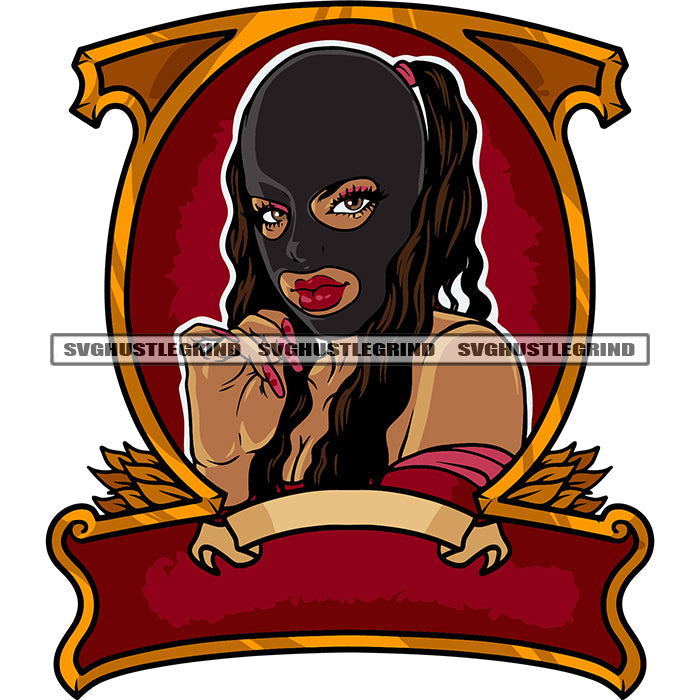 Gangster African American Woman Wearing Ski Mask Long Hairstyle Cute Face Long Nail Logo Design Element SVG JPG PNG Vector Clipart Cricut Silhouette Cut Cutting