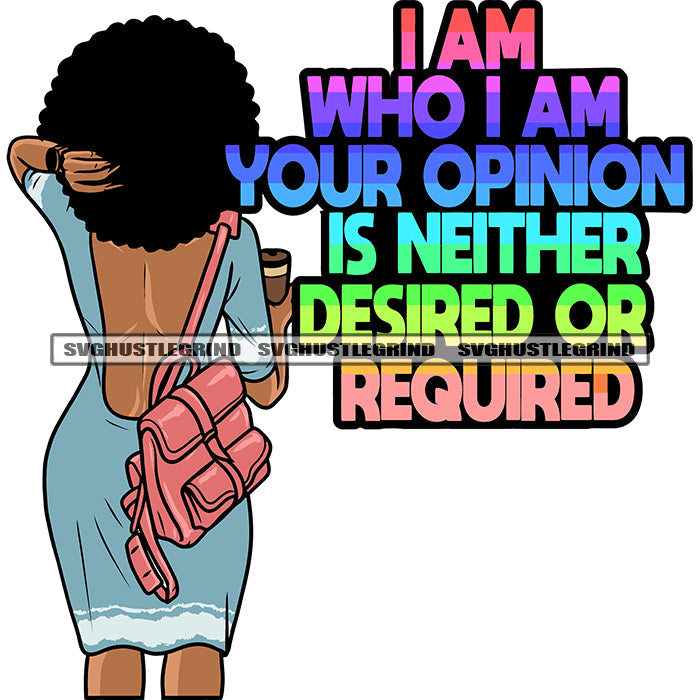 I Am Who I Am Your Opinion Is Neither Desired Or Required Quote Gangster African American Woman Hand Holding Coffee Mug Bag On Hand Design Element Afro Puffy Hairstyle White Background SVG JPG PNG Vector Clipart Cricut Silhouette Cut Cutting