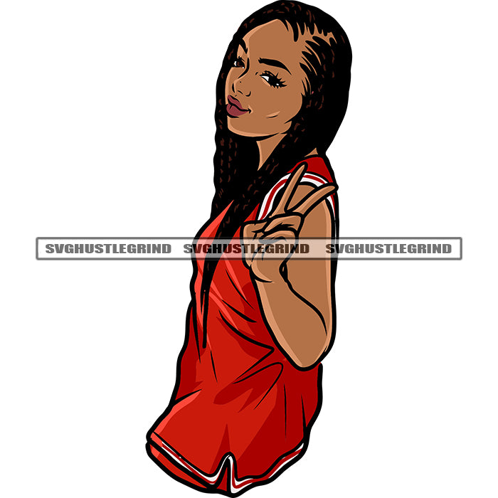 Peach Hand Sign African American Gangster Woman Wearing Sports Dress Basket Ball Dress Afro Long Hairstyle SVG JPG PNG Vector Clipart Cricut Silhouette Cut Cutting