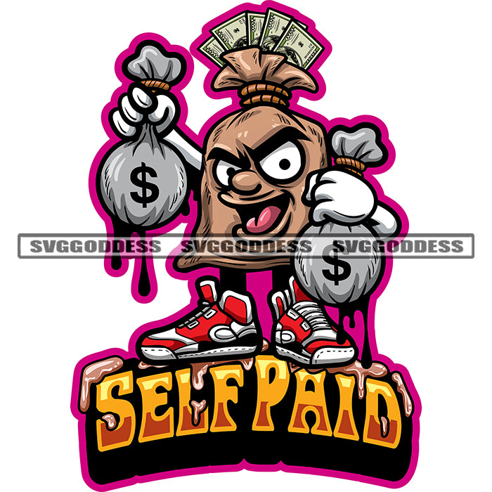 Self Paid Quote Funny Money Bag Cartoon Character Hand Holding Money Bag Red Line Artwork Blood Dripping Design Element Character Smile Face SVG JPG PNG Vector Clipart Cricut Silhouette Cut Cutting