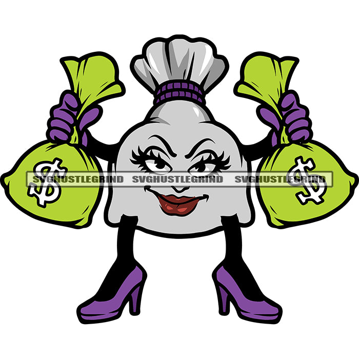 Smile Face Money Bag Cartoon Character Standing And Hand Holding Money Bag Design Element Wearing Shoe White Background SVG JPG PNG Vector Clipart Cricut Silhouette Cut Cutting