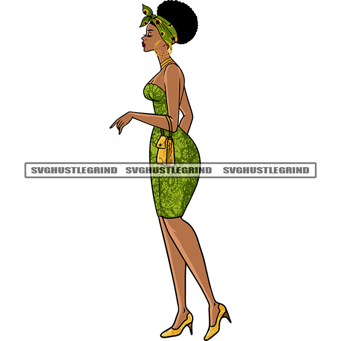 Slim Body African American Woman Standing Design Element Afro Girls Wearing Hoop Earing Afro Hairstyle SVG JPG PNG Vector Clipart Cricut Silhouette Cut Cutting