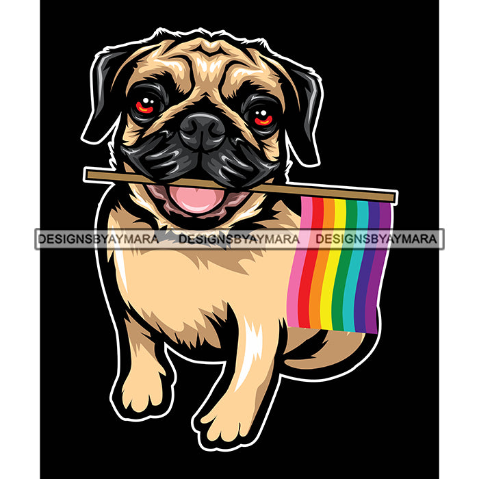 Pride Month Parade Celebration Cute Dog Holding Rainbow Flag Black Background SVG JPG PNG Vector Clipart Cricut Silhouette Cut Cutting