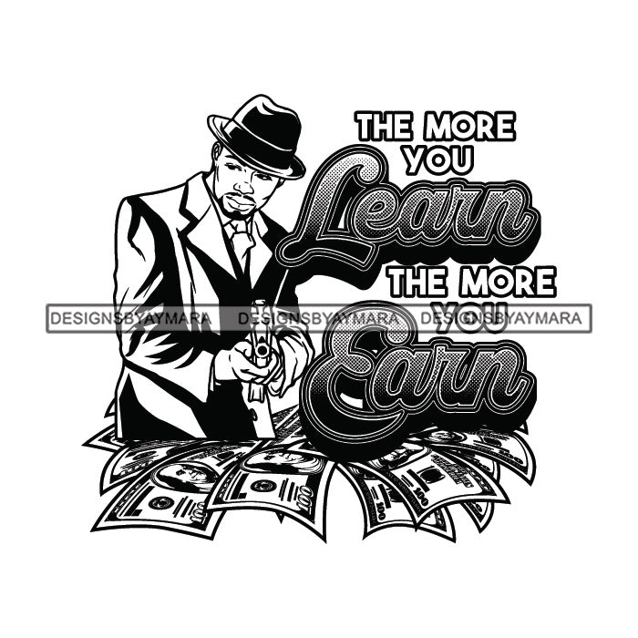 Sexy Black Man Hustle Quote Holding Gun Elegant Gangster Hat Fashion Style B/W SVG JPG PNG Vector Clipart Cricut Silhouette Cut Cutting