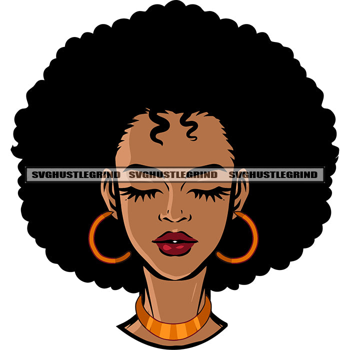 Melanin Woman Close Eyes African American Woman Smile Face Wearing Hoop Earing Puffy Hairstyle Design Element SVG JPG PNG Vector Clipart Cricut Silhouette Cut Cutting