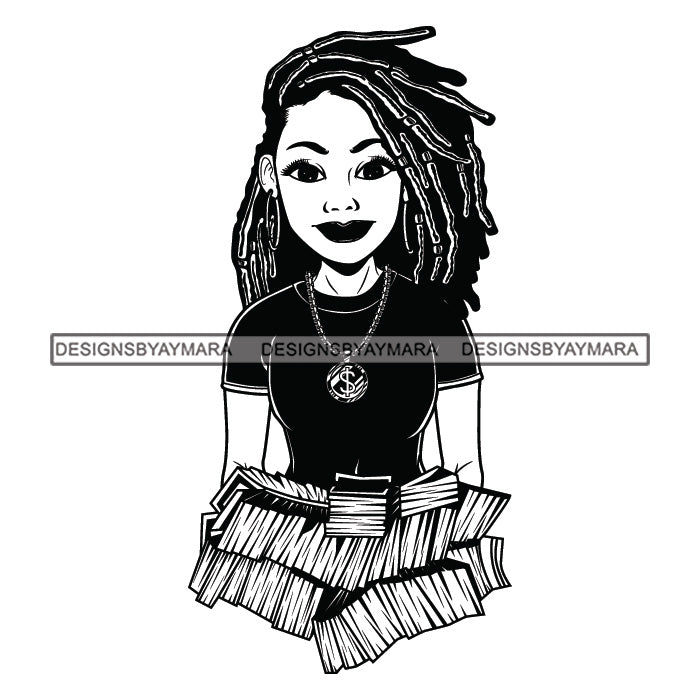 Afro Woman Holding Stacks Of Money Showing Off Melanin Necklace Dreadlocks Hairstyle B/W SVG JPG PNG Vector Clipart Cricut Silhouette Cut Cutting