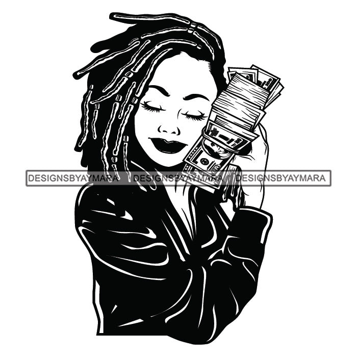 Afro Woman Hugging Money 100 Dollar Bill Hustler Showing Off Dreadlocks Hairstyle B/W SVG JPG PNG Vector Clipart Cricut Silhouette Cut Cutting