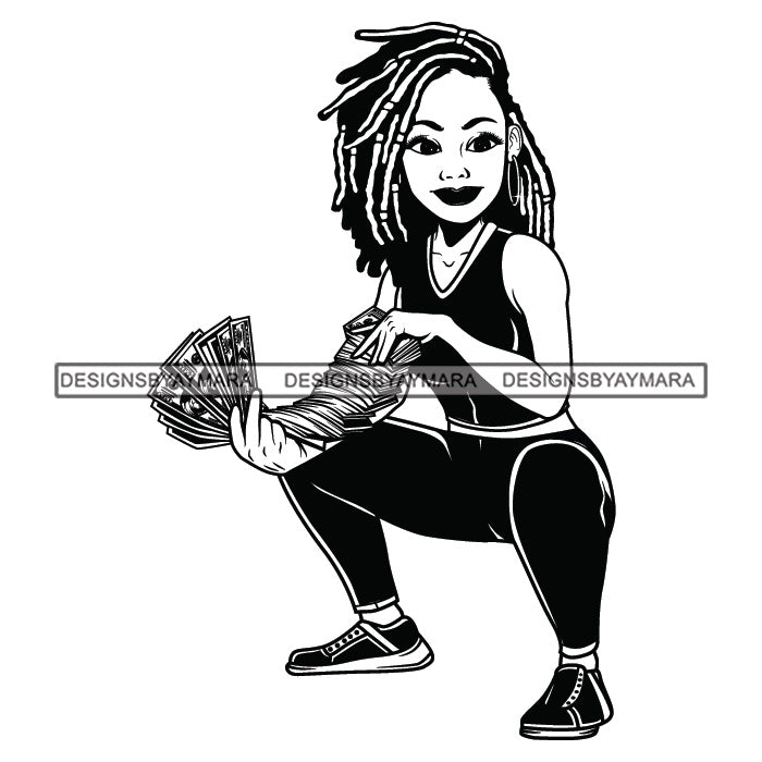 Afro Woman Squatting Holding A Fan Money Showing Off Dreadlocks Hairstyle B/W SVG JPG PNG Vector Clipart Cricut Silhouette Cut Cutting