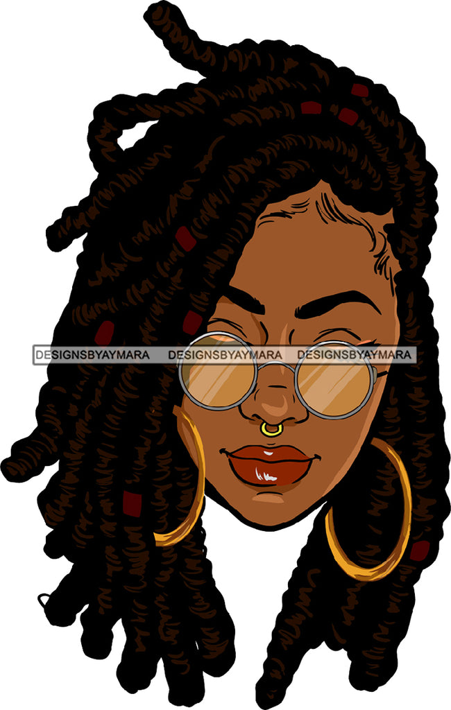 Black Woman Face Golden Gold Earrings Sunglasses Glasses Lipstick Makeup Dreadlocks Dreads Locs Hair Melanin Nubian African American Lady SVG JPG PNG Vector Clipart Cricut Silhouette Cut Cutting
