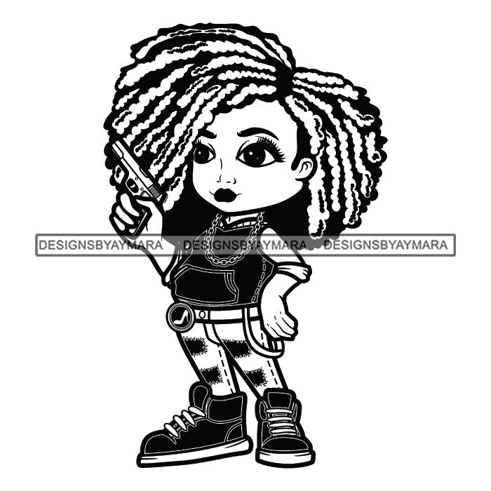 Cute Afro Girl Urban Hipster Girl Tomboy Cowboy Girl Holding Pistols Joggers Sneakers Dreadlocks Hairstyle Swag Fashion B/W SVG JPG PNG Vector Clipart Cricut Silhouette Cut Cutting
