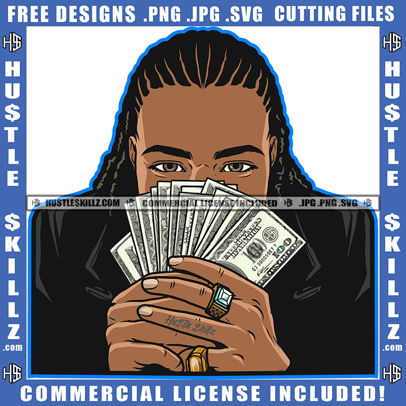 Handsome Brown Eyed Black Man Braids Locs Holding Cash Money Two Rings Hustler Melanin Boy Hustler Hustling SVG JPG PNG Vector Clipart Cricut Cutting Files