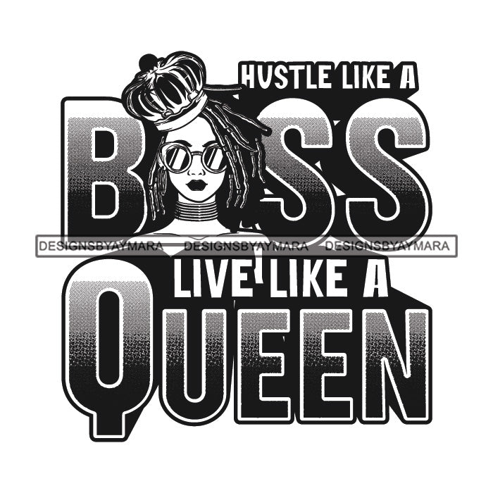 Sassy Afro Woman Hustle Money Quote Crowned Queen Dreadlocks Hairstyle B/W SVG JPG PNG Vector Clipart Cricut Silhouette Cut Cutting