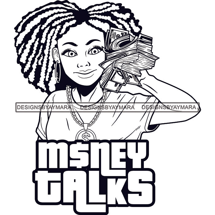 Sassy Afro Woman Money Talks Prosperity Dollars Dreadlocks Hairstyle B/W SVG JPG PNG Vector Clipart Cricut Silhouette Cut Cutting