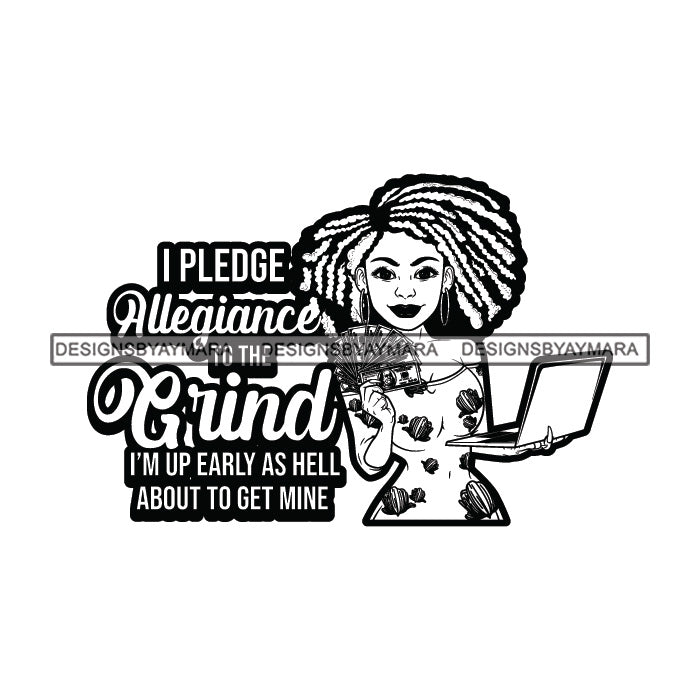 Sassy Afro Woman Hustle Money Quote Holding Laptop Dollars Dreadlocks Hairstyle B/W SVG JPG PNG Vector Clipart Cricut Silhouette Cut Cutting