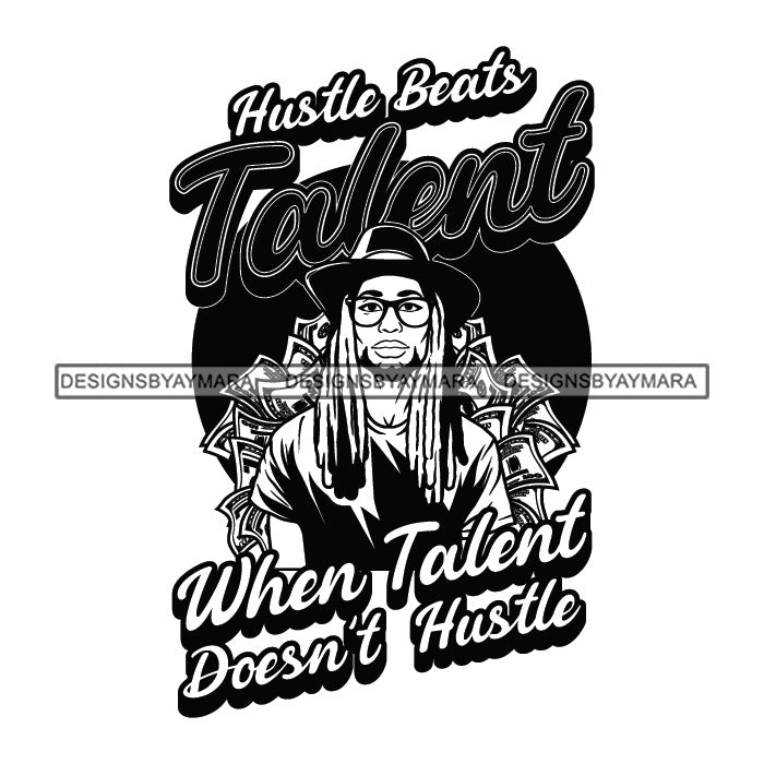 Sexy Black Man Hustle Quote Glasses Cowboy Hat Style Long Dreadlocks Hairstyle B/W SVG JPG PNG Vector Clipart Cricut Silhouette Cut Cutting