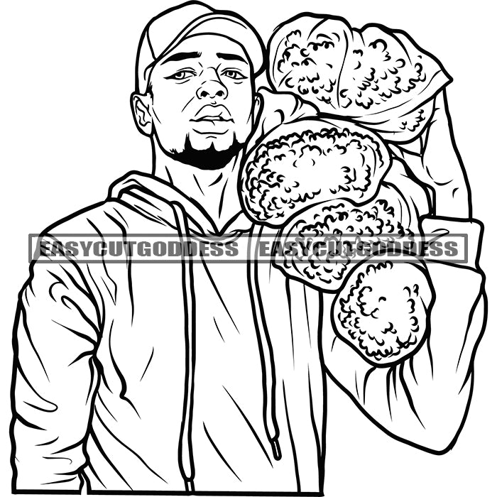 African American Gangster Boy Holding Marijuana Packet Wearing Cap Smile Face Design Element BW Artwork SVG JPG PNG Vector Clipart Cricut Silhouette Cut Cutting