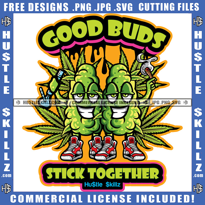 Good Buds Stick Together Quote Funny Weed Leaf Cartoon Mascot Dripping Design Element Marijuana Leaf Cartoon Holding Weed Blunt Smoke Pot Stoned Cannabis High Life Silhouette SVG JPG PNG Vector Clipart Cricut Cutting Files