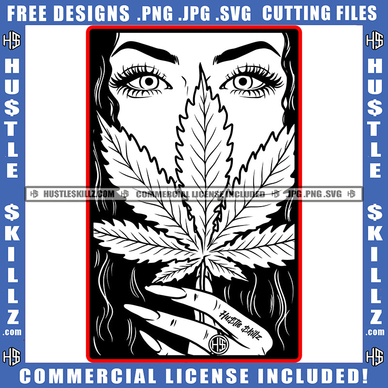 Green Eye Melanin Women Holding Marijuana Leaf BW Vector Portrait Long Nail Ring Afro American Women Cannabis High Life Silhouette SVG JPG PNG Vector Clipart Cricut Cutting Files