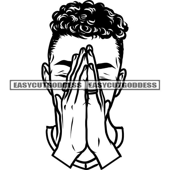 African American Smart Boy Hard Praying Hand Head Black And Hand Artwork Afro Short Hairstyle Design Element Wearing T-Shirt And Watch Vector SVG JPG PNG Vector Clipart Cricut Silhouette Cut Cutting