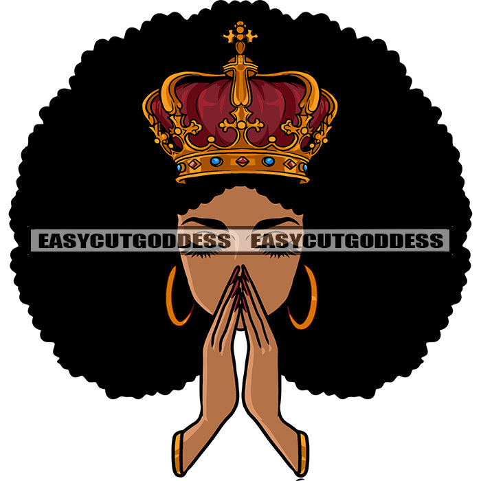 Gangster African American Woman Hard Praying Hand Woman Cute Face Wearing Hoop Earing Crown On Head Close Eyes Design Element Puffy Hairstyle SVG JPG PNG Vector Clipart Cricut Silhouette Cut Cutting