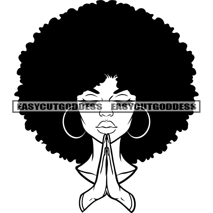 Hard Praying Hand Black And White Artwork Afro Woman Face Design Element Afro Hairstyle African American Woman Close Eyes Wearing Hoop Earing Vector SVG JPG PNG Vector Clipart Cricut Silhouette Cut Cutting