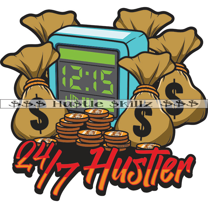 24/7 Hustler Color Quote Clock And Lot Of Money Bags Showing Off Business Grind Bank Wealth Cash Vector Gold Coin On Money Bag Side Design Element White Background SVG JPG PNG Vector Clipart Cricut Cutting Files